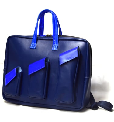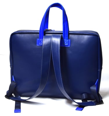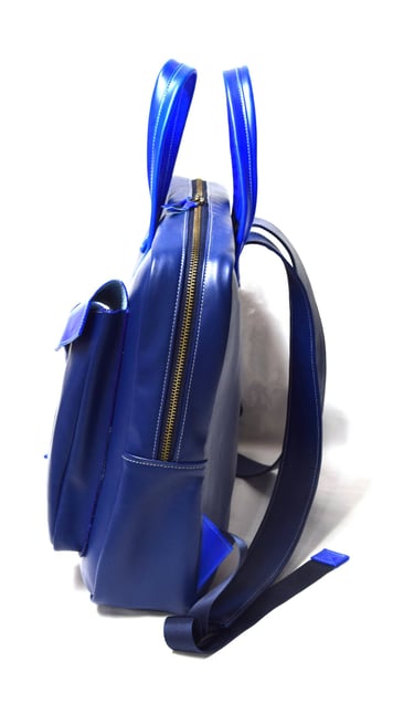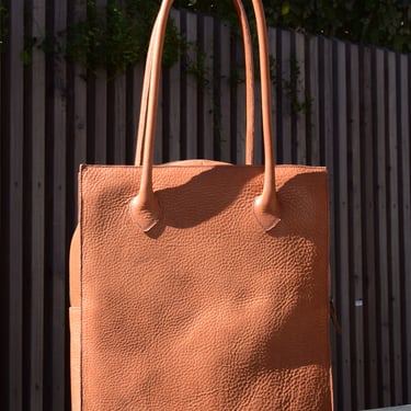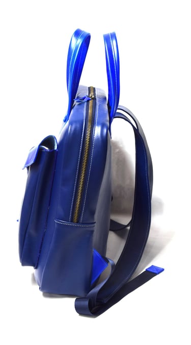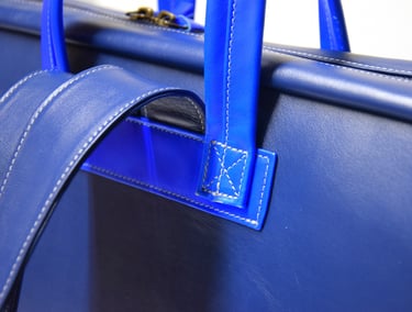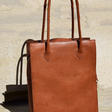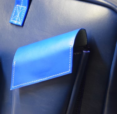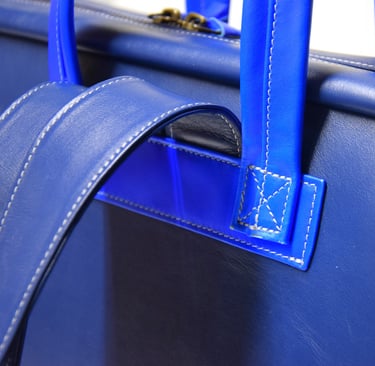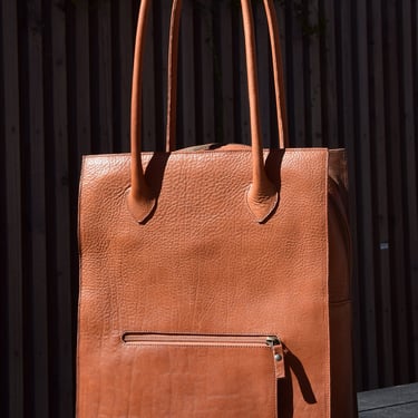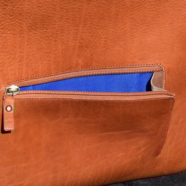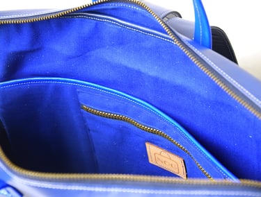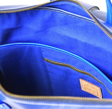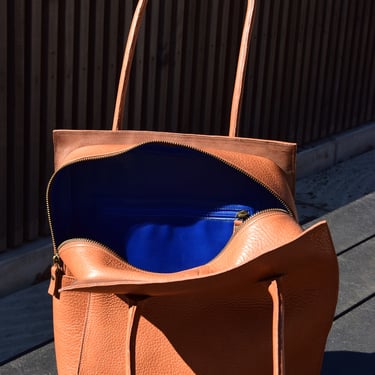 De shopper heeft ook een aangestikte bies en is gemaakt van plantaardig gelooid leer. De tas heeft een rondgenaaid handvat en heeft een ritsvakje op de achterkant voor je sleutels of pasjes. Ook deze tas heeft een vel blauwe voering van geitenleer.