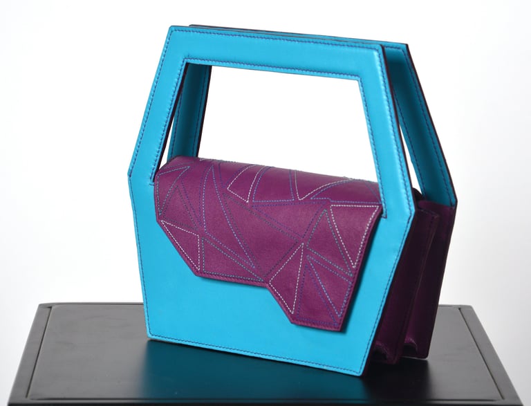 De klep van de tas is geborduurd met verschillende vormen. In het handvat van de tas is een stuk aluminium verwerkt om de vorm te behouden. Het handvat is tevens ook met de hand gestikt.